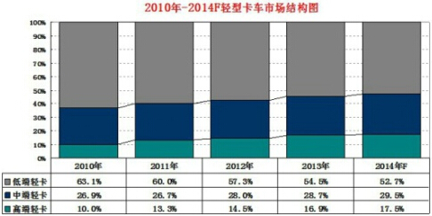 据中汽协会统计,2004年国产轻型卡车(含整车、各类底盘、专用改装车及皮卡车型等混乱统计)销量为80多万辆,自2007年国产轻型卡车产销量超过111多万辆以来至2013年,销量已经达到190多万辆(中国汽车市场研究会商用车分会统计销量约为146.5万辆,其中剔除皮卡型车辆及专用改装车),今年也有可能达到190万辆(中国汽车市场研究会商用车分会预计约为销量140万辆左右)。